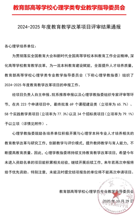 教育部心理学类专业教指委教改项目,是推动高校心理学专业教学创新、优化人才培养模式的重要平台,对提升专业教学质量、强化育人实效具有重要指导意义。此次立项,是应用心理学教研室继李俊茹老师主持的《立德树人视域下大学生心理健康教育课程思政教学改革与实践》和卢双双老师主持的《基于OBE理念的心理与教育研究方法课程教学改革研究》之后的第三个心理学教指委教改项目,彰显了教师教育学院在教学改革领域的持续深耕与不懈努力。