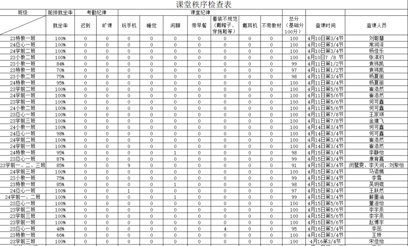 为落实全流程课堂秩序检查与管理,学院构建了多维度、立体化的检查体系:以教学巡查、抽班查课、随班听课为三大主线,将检查与监督落实到每一堂课堂;学工队伍与学生干部协同联动,严格开展课堂秩序检查,及时纠正扰乱课堂纪律的行为;辅导员严格考勤管理,掌握学生出勤情况;任课教师实时反馈课堂状态,与学工团队保持密切沟通,形成管理闭环,切实保障教学秩序规范有序,推动教学质量稳步提升。