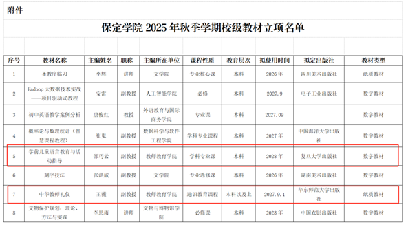 根据《保定学院教材管理办法(修订)》(校党字〔2024〕10号)相关规定,我校于2025年10月启动了2025年秋季学期校级教材立项申报工作。二级学院推荐并进行政治把关,校内评审专家组严格遵循评审标准,对各申报教材进行了客观、公正的评审与点评,并提出了中肯的意见与建议。经过综合评定,学校拟确定8种教材作为2025年秋季学期校级立项教材,我院邵巧云老师的《学前儿童语言教育与活动指导》、王薇老师的《中华教师礼仪》两种教材确定为2025年秋季学期校级立项教材。